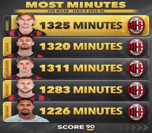 Score90統(tǒng)計了米蘭球員本賽季意甲出場時間,并列出榜單,40歲莫德里奇1325分鐘居首,他僅有25分鐘未在場上。